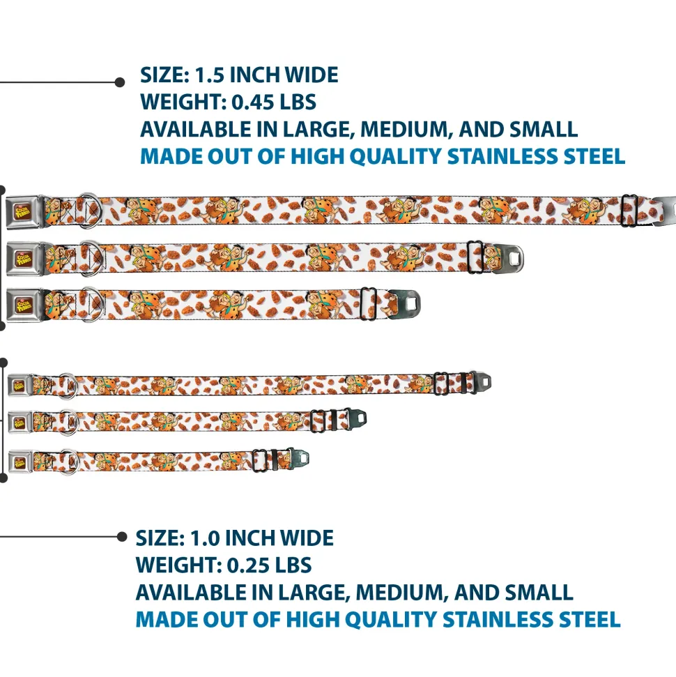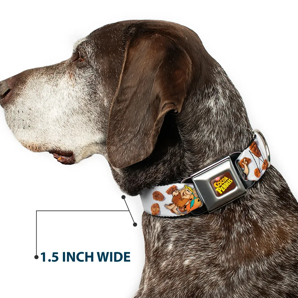 POST COCOA PEBBLES Logo Full Color Brown/Yellows Seatbelt Buckle Collar – Cocoa Pebbles Fred Flintstone and Barney Rubble Hugging Pose and Cereal Pebbles Scattered White/Browns