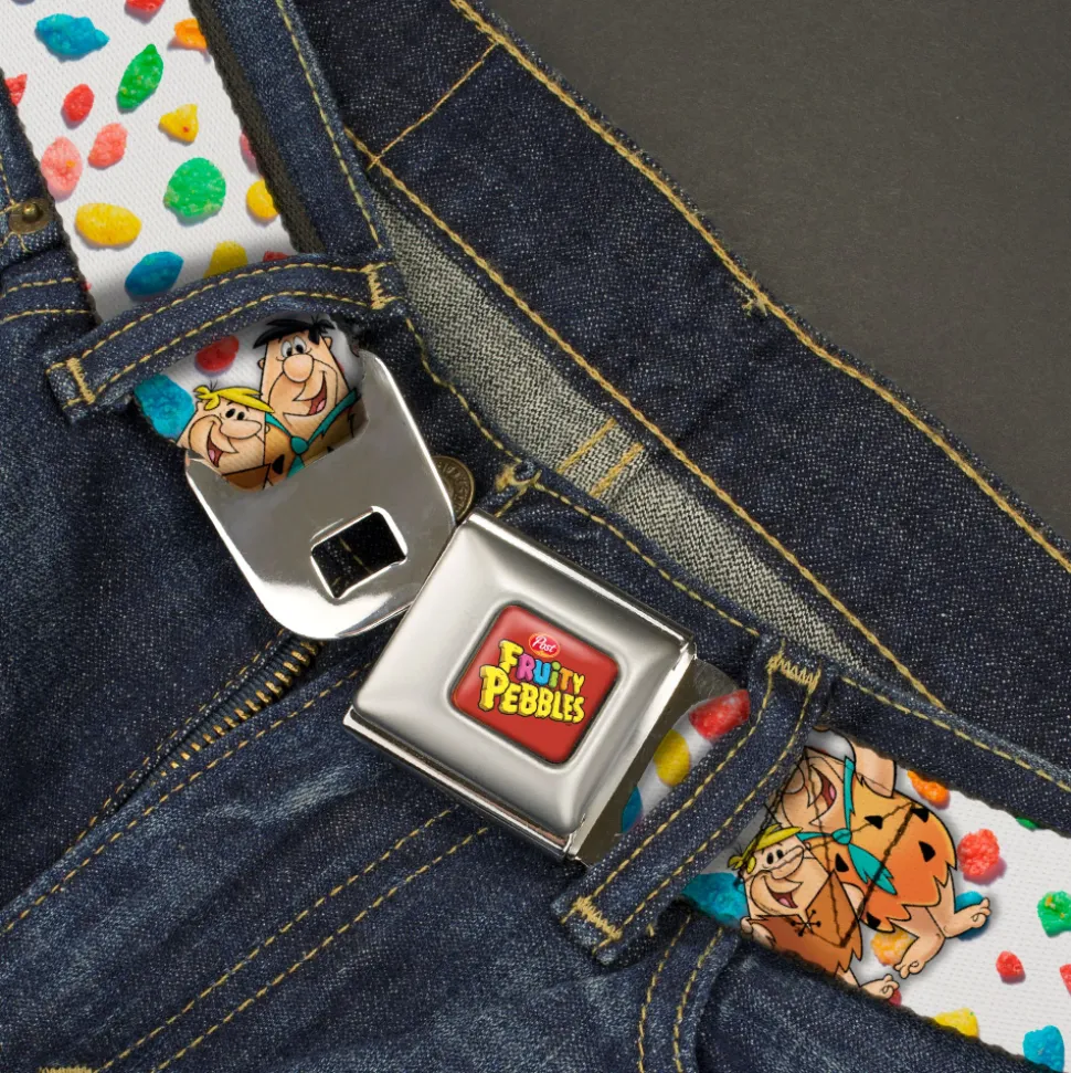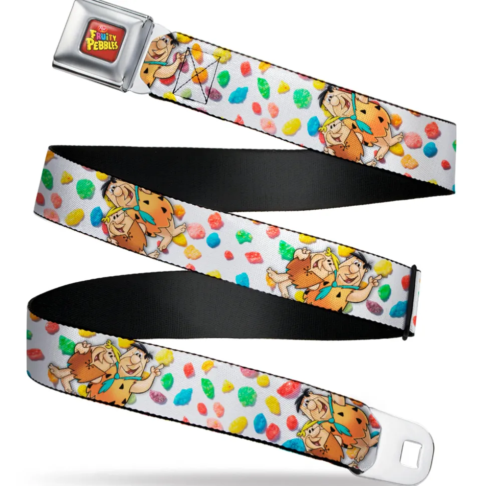 POST FRUITY PEBBLES Logo Full Color Red/Multi Color Seatbelt Belt – Fruity Pebbles Fred Flintstone and Barney Rubble Hugging Pose and Cereal Pebbles Scattered White/Multi Color Webbing