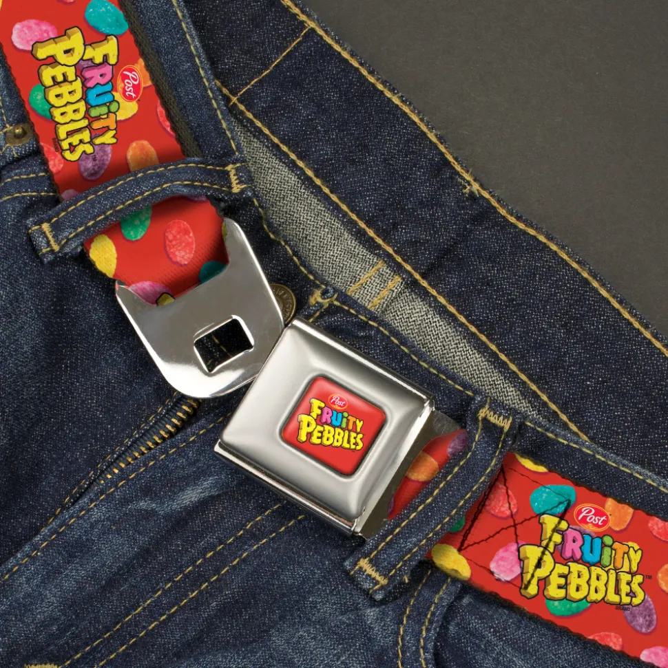 POST FRUITY PEBBLES Logo Full Color Red/Multi Color Seatbelt Belt – POST FRUITY PEBBLES Logo and Cereal Pebbles Scattered Red/Multi Color Webbing