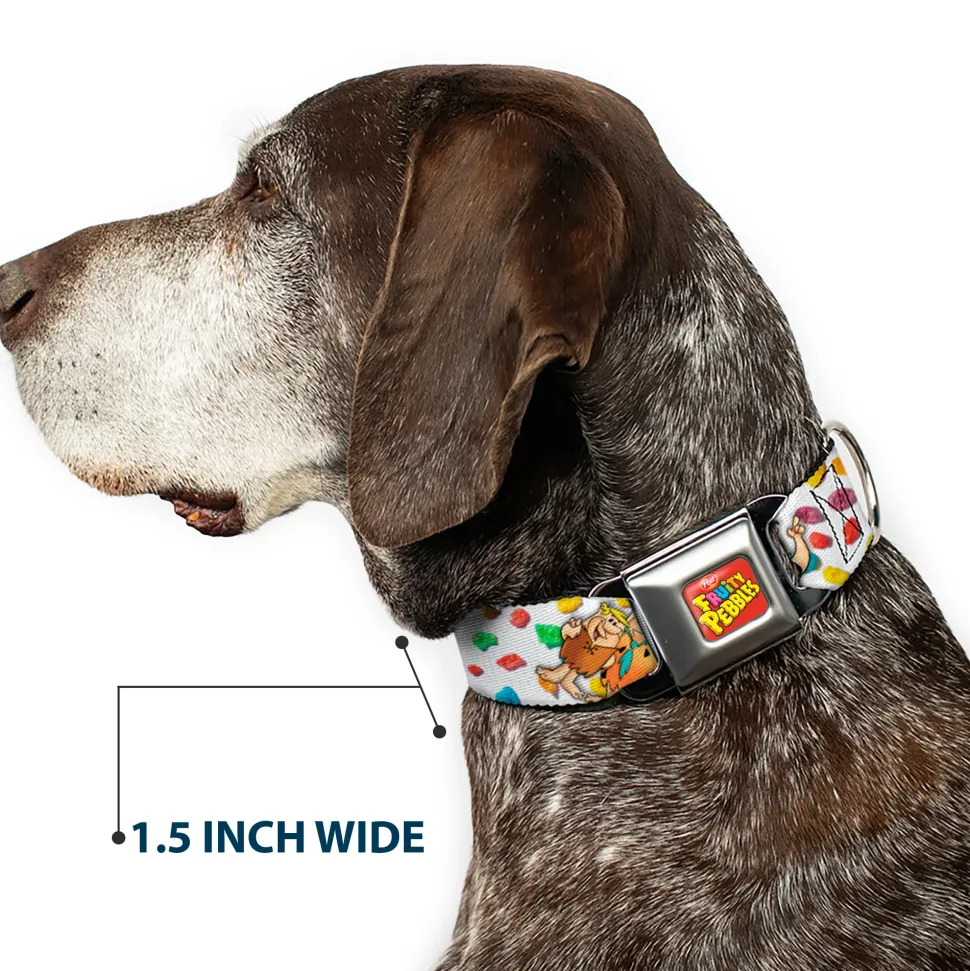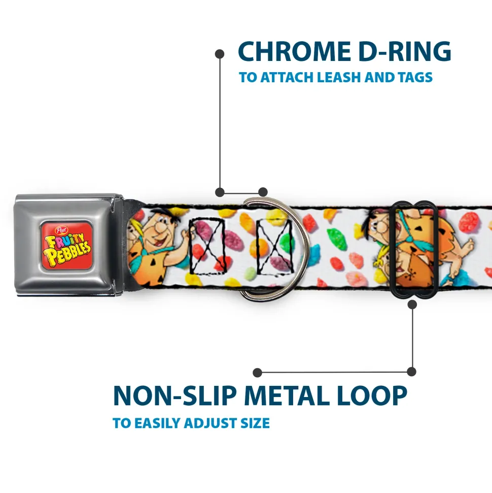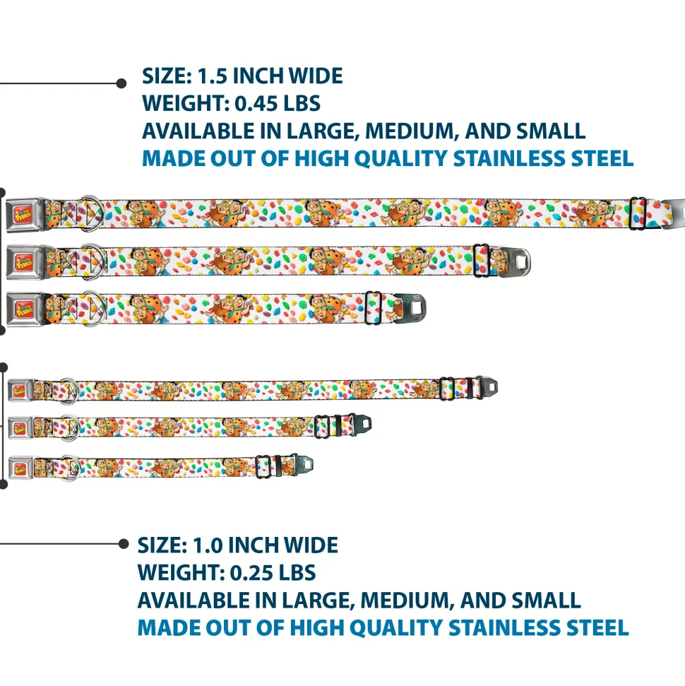 Your dog will be the talk of the town when people notice they’re wearing this awesome SeatBelt Dog Collar! Made from high-density polyester and durable steel components, this collar is built to last. It features beautiful vibrant artwork. The buckle is a miniature authentic SeatBelt Buckle, so you press the center button to release the clasp. This product is assembled in the USA by Buckle-Down Inc. and officially licensed by The Flintstones.