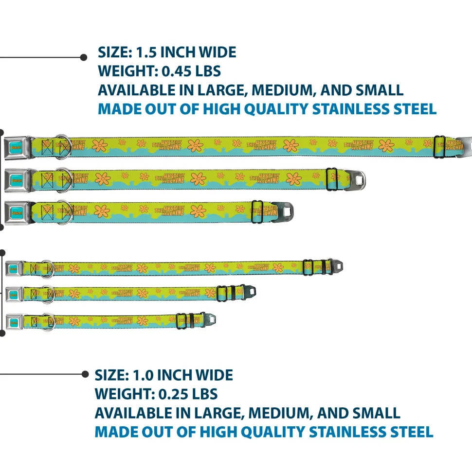 Your dog will be the talk of the town when people notice they’re wearing this awesome SeatBelt Dog Collar! Made from high-density polyester and durable steel components, this collar is built to last. It features beautiful vibrant artwork. The buckle is a miniature authentic SeatBelt Buckle, so you press the center button to release the clasp. This product is Made in USA by Buckle-Down Inc. and officially licensed by Scooby Doo.