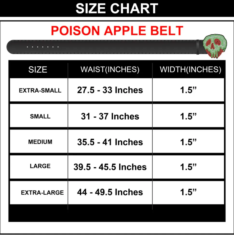 This awesome Disney logo belt is made from premium vegan leather and features an awesome Snow White poison apple buckle. This belt is 1.5 inches wide and comes in five sizes: Extra-Small, Small, Medium, Large and Extra-Large. Perfect addition to any ensemble requiring a waist belt, such as dresses, coats, and skirts! This belt does fit through pant loops. This product is Officially Licensed by Disney.