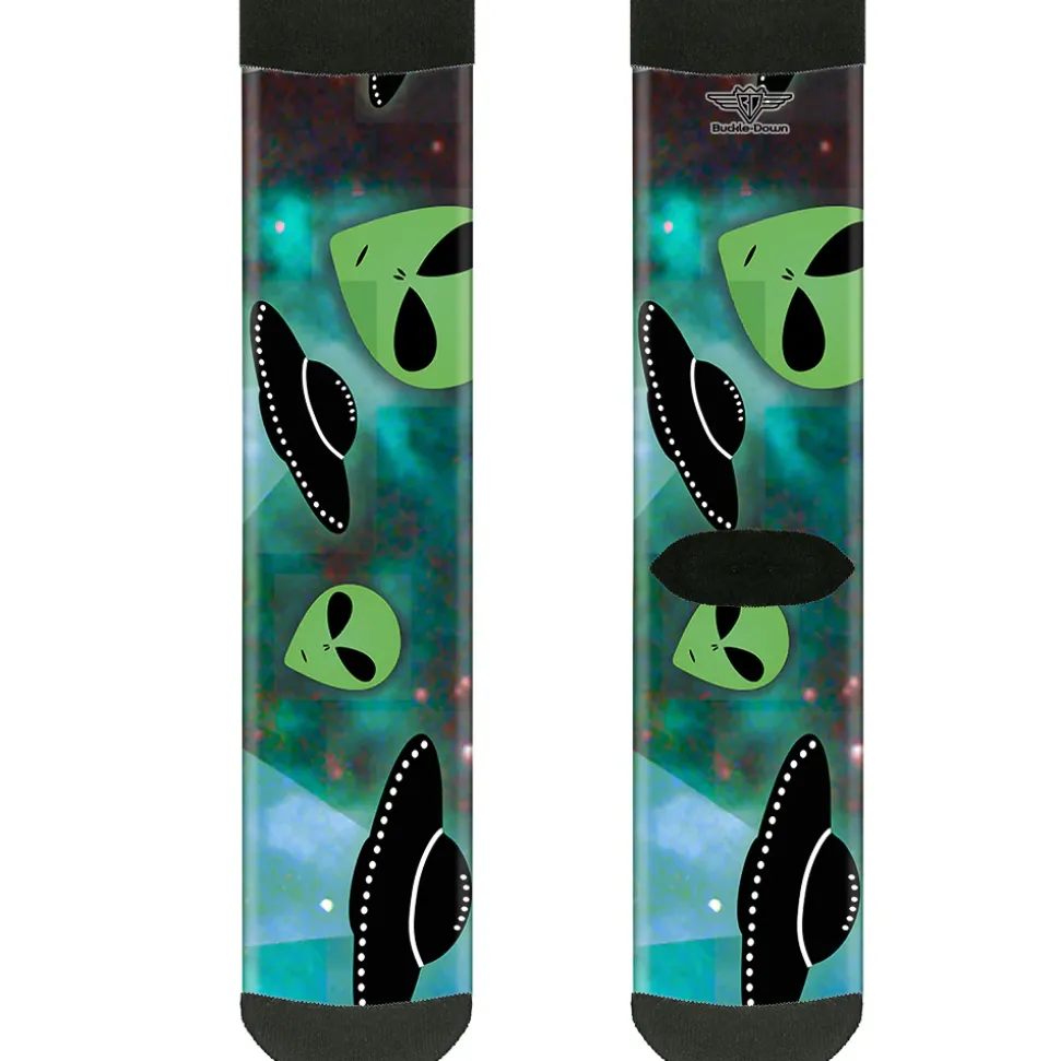 Sock Pair - Polyester - Aliens & UFO's Galaxy/Green/Black/White - CREW