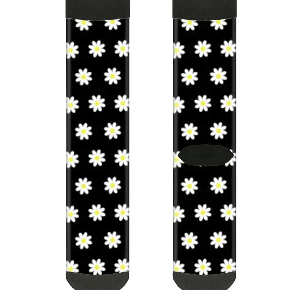Sock Pair - Polyester - Daisies Scattered Black White Yellow - CREW