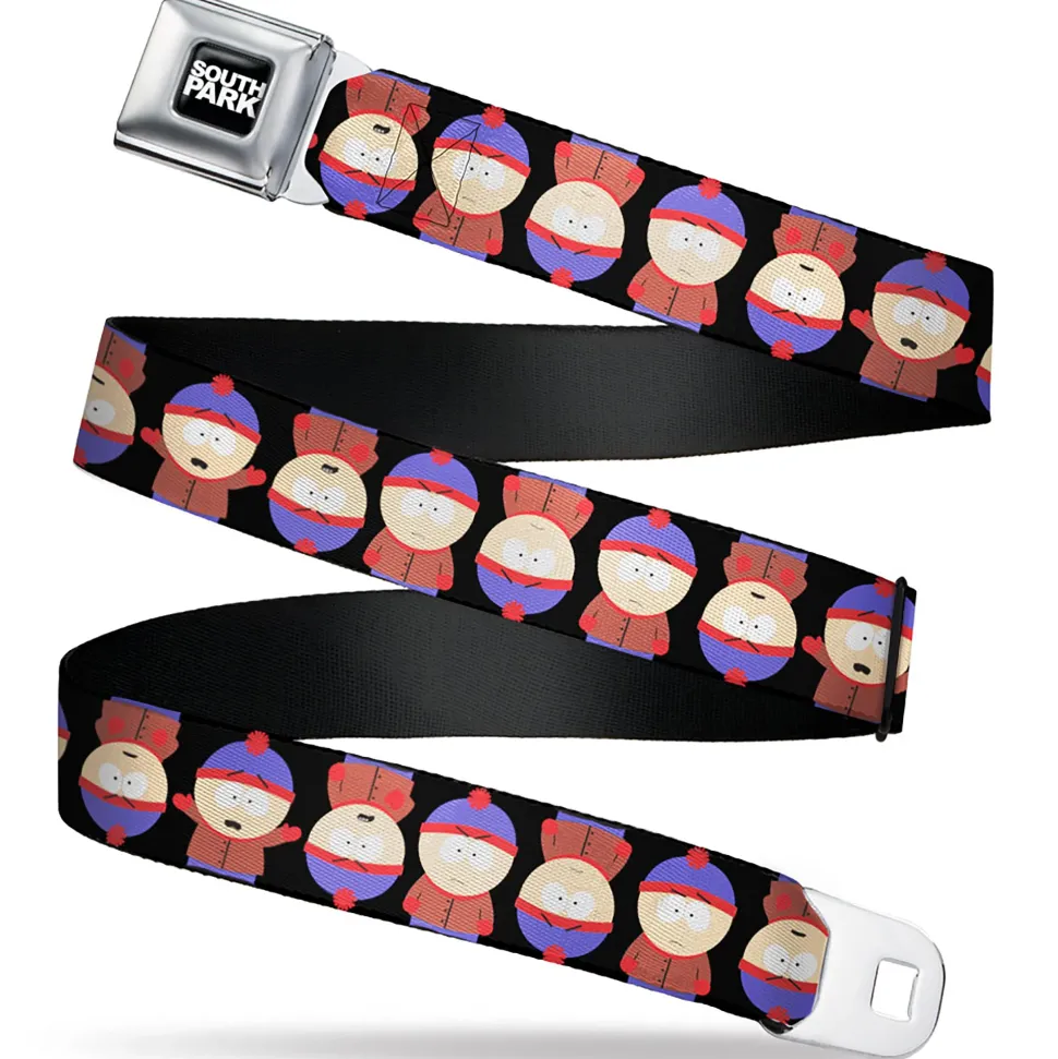 SOUTH PARK Title Logo Full Color Black/White Seatbelt Belt – South Park Stan Flip Poses Black Webbing