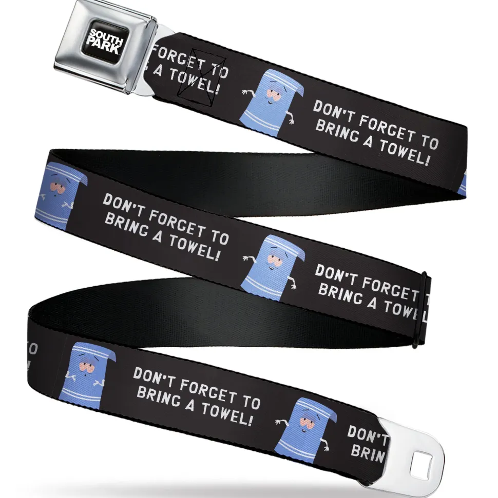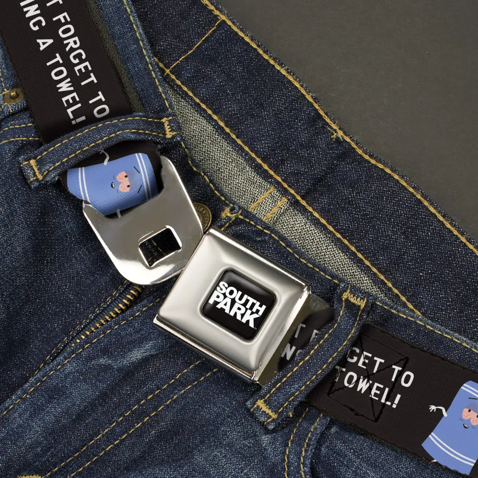 SOUTH PARK Title Logo Full Color Black/White Seatbelt Belt – South Park Towlie DON’T FORGET TO BRING A TOWEL Pose Black Webbing