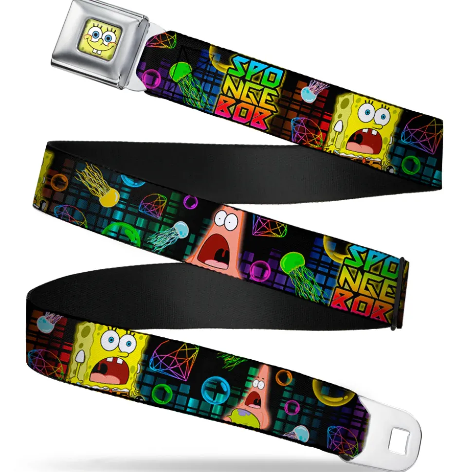 Sponge Bob Face CLOSE-UP Full Color Seatbelt Belt – Surprised SpongeBob & Patrick Starfish/SPONGEBOB/Jellyfish Black/Multi Color Webbing