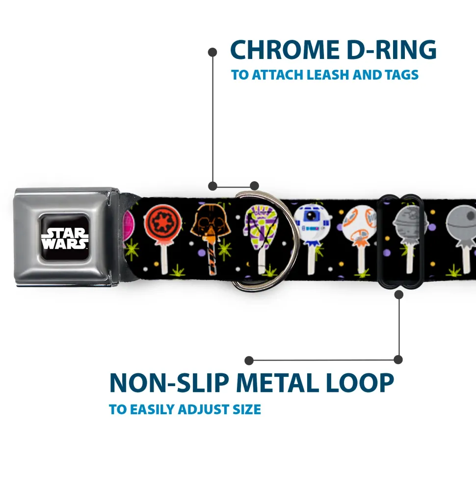 Your dog will be the talk of the town when people notice they’re wearing this awesome SeatBelt Dog Collar! Made from high-density polyester and durable steel components, this collar is built to last. It features beautiful vibrant artwork. The buckle is a miniature authentic SeatBelt Buckle, so you press the center button to release the clasp. This product is Made in USA by Buckle-Down Inc. and officially licensed by Star Wars.