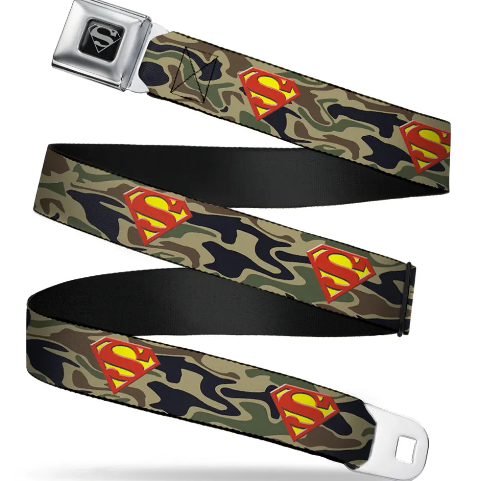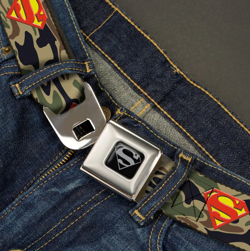 Superman Black Silver Seatbelt Belt – Superman Shield Camo Olive Webbing