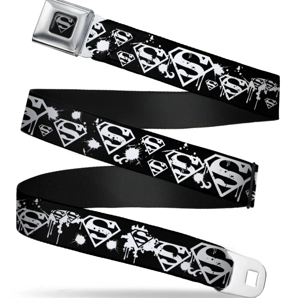Superman Black Silver Seatbelt Belt – Superman Shield Splatter Black/White Webbing