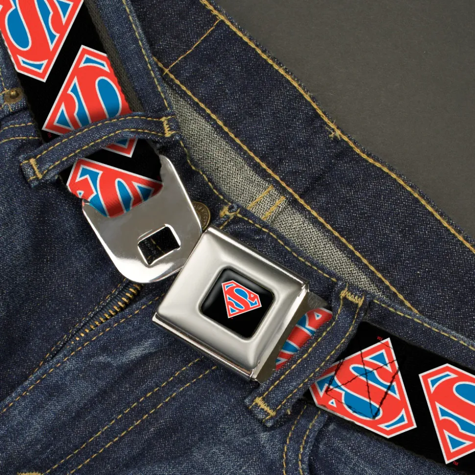 Superman Shield Full Color Black/White/Red/Blue Seatbelt Belt – Superman Shield Flip Americana Black/White/Red/Blue Webbing