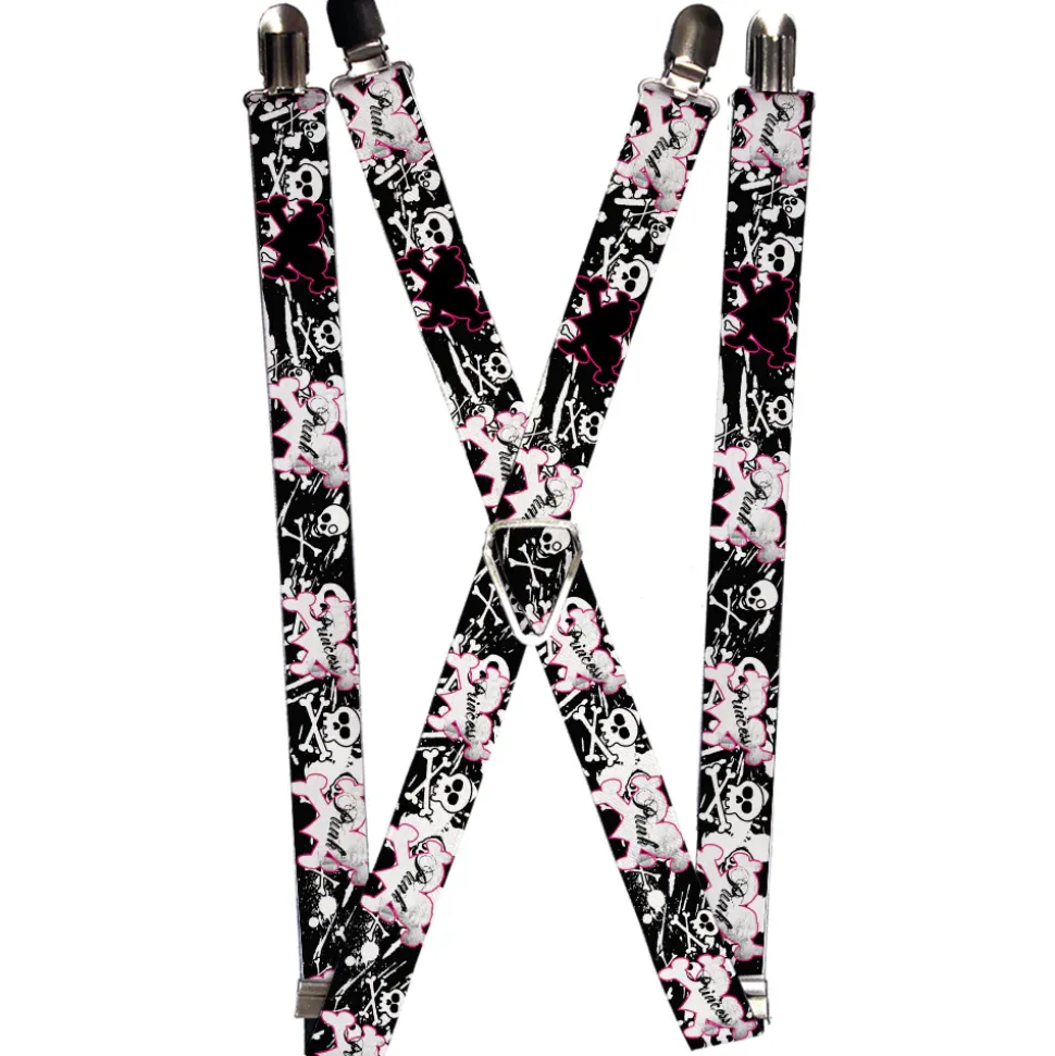Suspenders – 1.0" – Punk Princess Heart & Cross Bones w/Skulls & Splatter Black/White