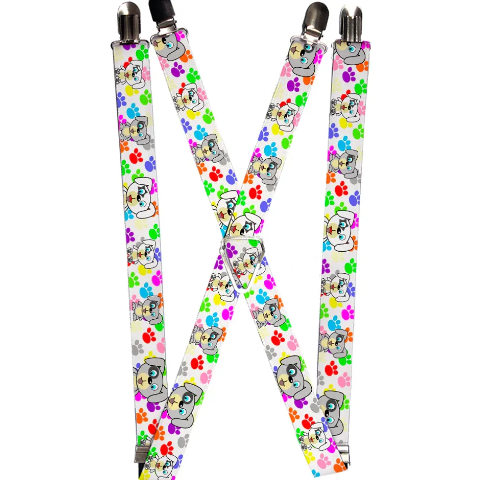Suspenders – 1.0" – Puppies w/Paw Prints White/Multi Color