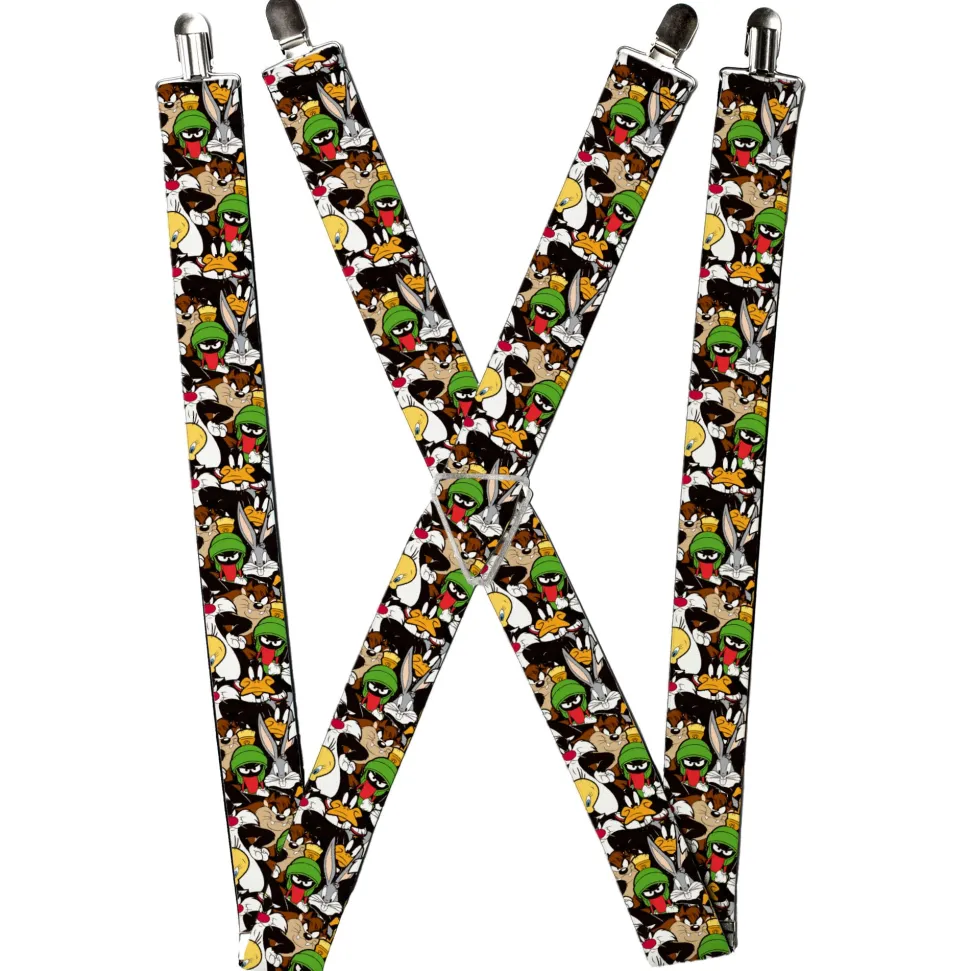 These suspenders are a great way to make a fashion statement! They are elastic with steel-plated hardware, 1.5 inch wide, and adjust to fit most people. This product is Assembled in the USA by Buckle-Down, Inc. and Officially Licensed by Looney Tunes.