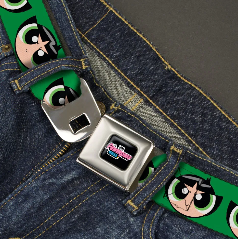THE POWERPUFF GIRLS Animated Series Title Logo Full Color Black Seatbelt Belt – The Powerpuff Girls Buttercup Face Close-Up Green Webbing