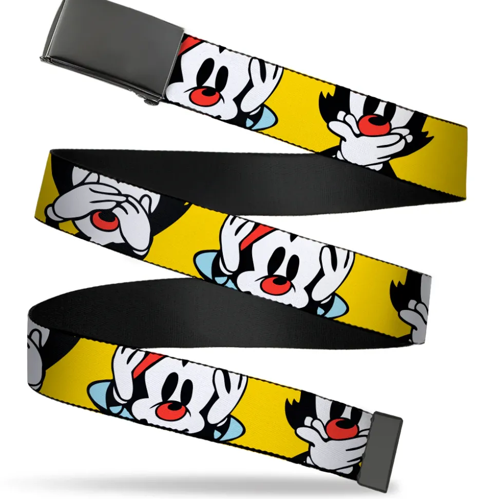 This unique web belt features a solid plain military-style clasp Buckle. It features beautiful artwork which is dyed into the fabric to ensure it looks great for years. This belt is available in 1.0″, 1.25″, and 1.5″ widths. 1.0″ wide belt is sized for children and adults with pants size 30 or lower. 1.25″ and 1.5″ wide belts are sized for adults, fitting up to pant size 42. This web belt is made from high-density nylon and steel. 1.5″ wide belt also has a bottle opener built into the back of the buckle! This product is Made in the USA by Buckle-Down Inc. and is officially licensed by Animaniacs.