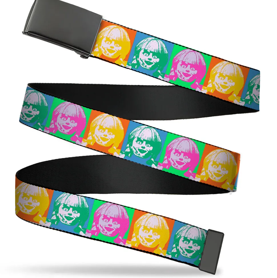 Web Belt Blank Black Buckle – Annabelle Doll Face Pop Art Color Block Multi Color Webbing