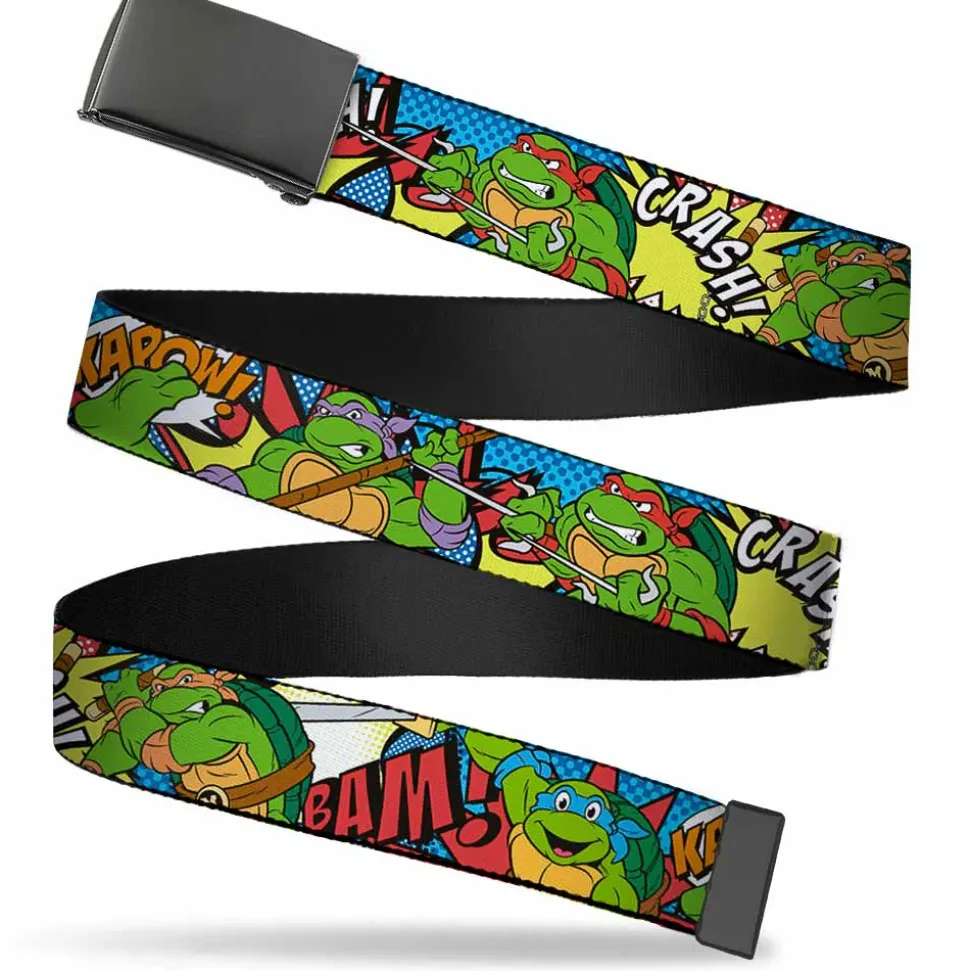 Web Belt Blank Black Buckle – Classic Teenage Mutant Ninja Turtles Action Poses/Action Bubbles Dots Blues Webbing