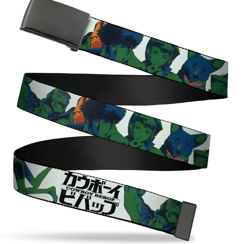 Web Belt Blank Black Buckle – COWBOY BEBOP Crew Group Pose and Title Logo White/Black/Greens Webbing