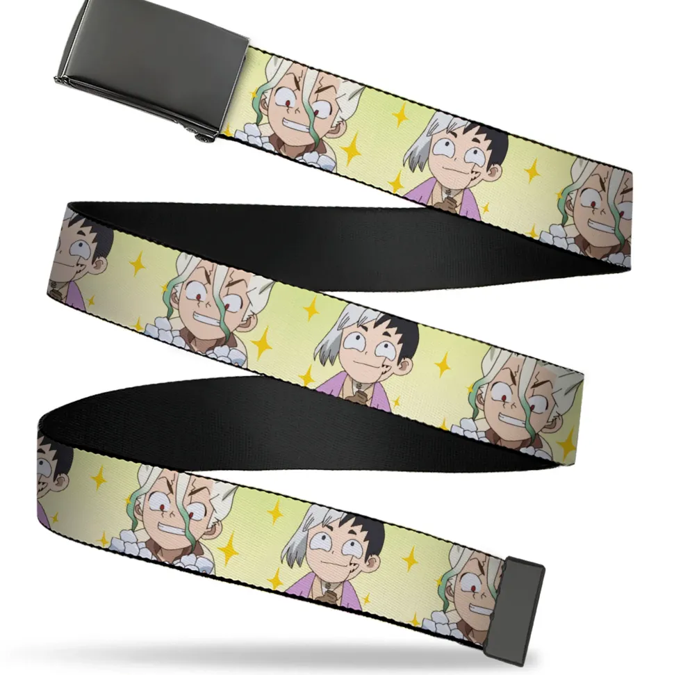 Web Belt Blank Black Buckle – Dr. Stone Chibi Senku and Gen Faces Stars Yellows Webbing