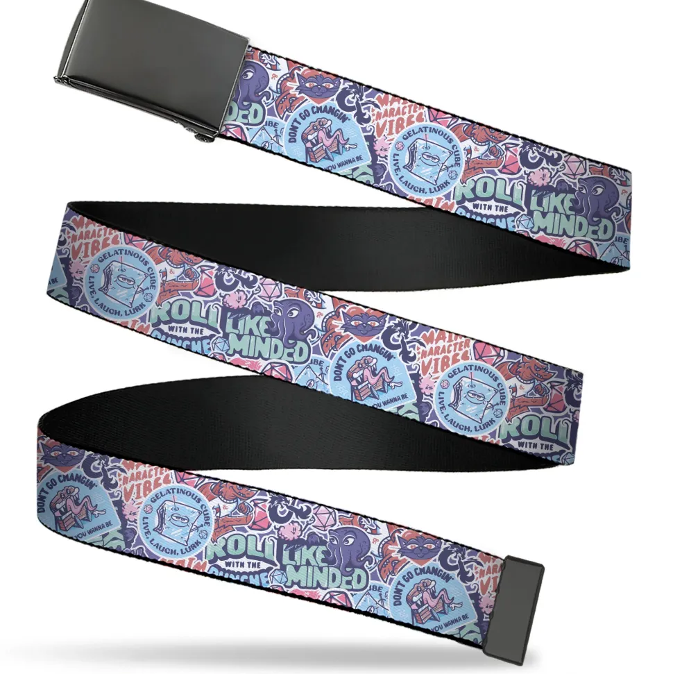 Web Belt Blank Black Buckle - Dungeons & Dragons ROLL WITH THE LIKE MINDED Icons Collage Blues/Pinks Webbing