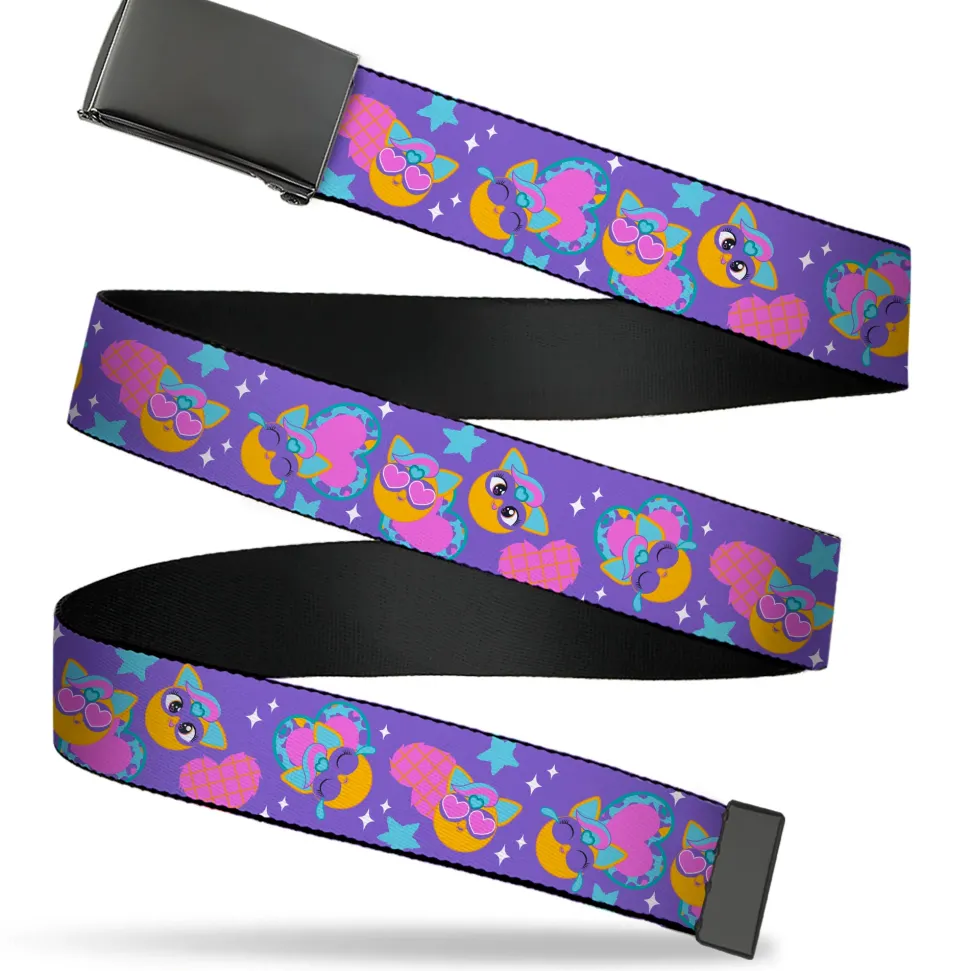 Web Belt Blank Black Buckle - Fuby Furbmojis and Icons Collage Purple/Blues/Pinks Webbing