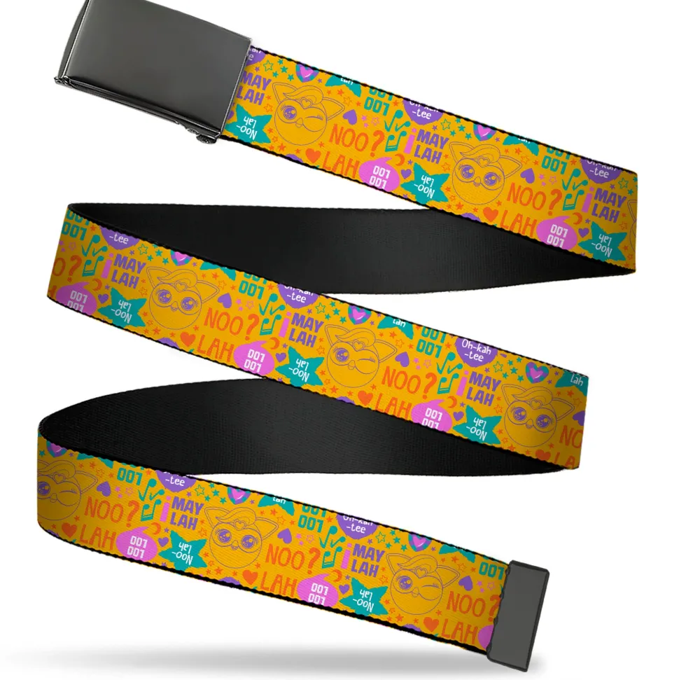 Web Belt Blank Black Buckle – Furby Furbmoji and Furbish Phrases and Icons Orange/Pink/Purple Webbing