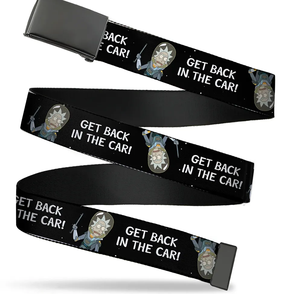 Web Belt Blank Black Buckle – Rick and Morty Rick GET BACK IN THE CAR Pose Black/White Webbing