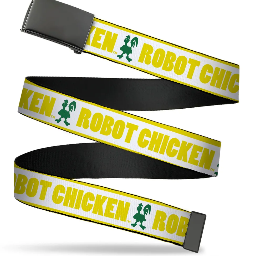 Web Belt Blank Black Buckle – ROBOT CHICKEN Chicken Silhouette Yellow/White/Green Webbing