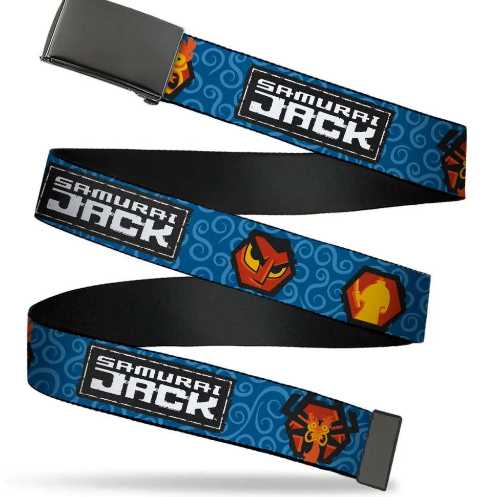 Web Belt Blank Black Buckle – SAMURAI JACK Title Logo and Icons with Swirl Blues Webbing