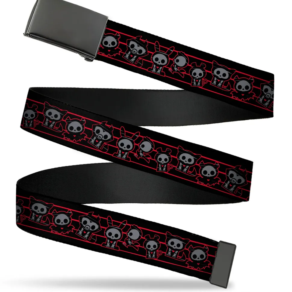 Web Belt Blank Black Buckle – Skelanimals Six Character Collage Black/Red/Grays Webbing