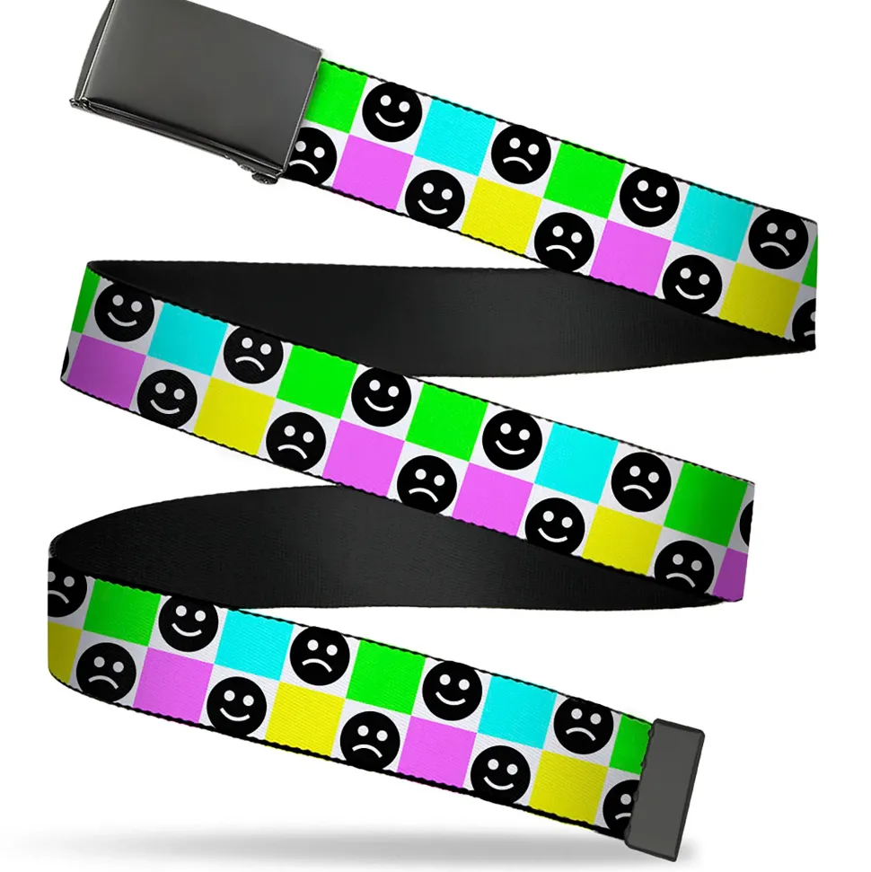 Web Belt Blank Black Buckle – Smiley Sad Face Checker Multi Color/White Webbing