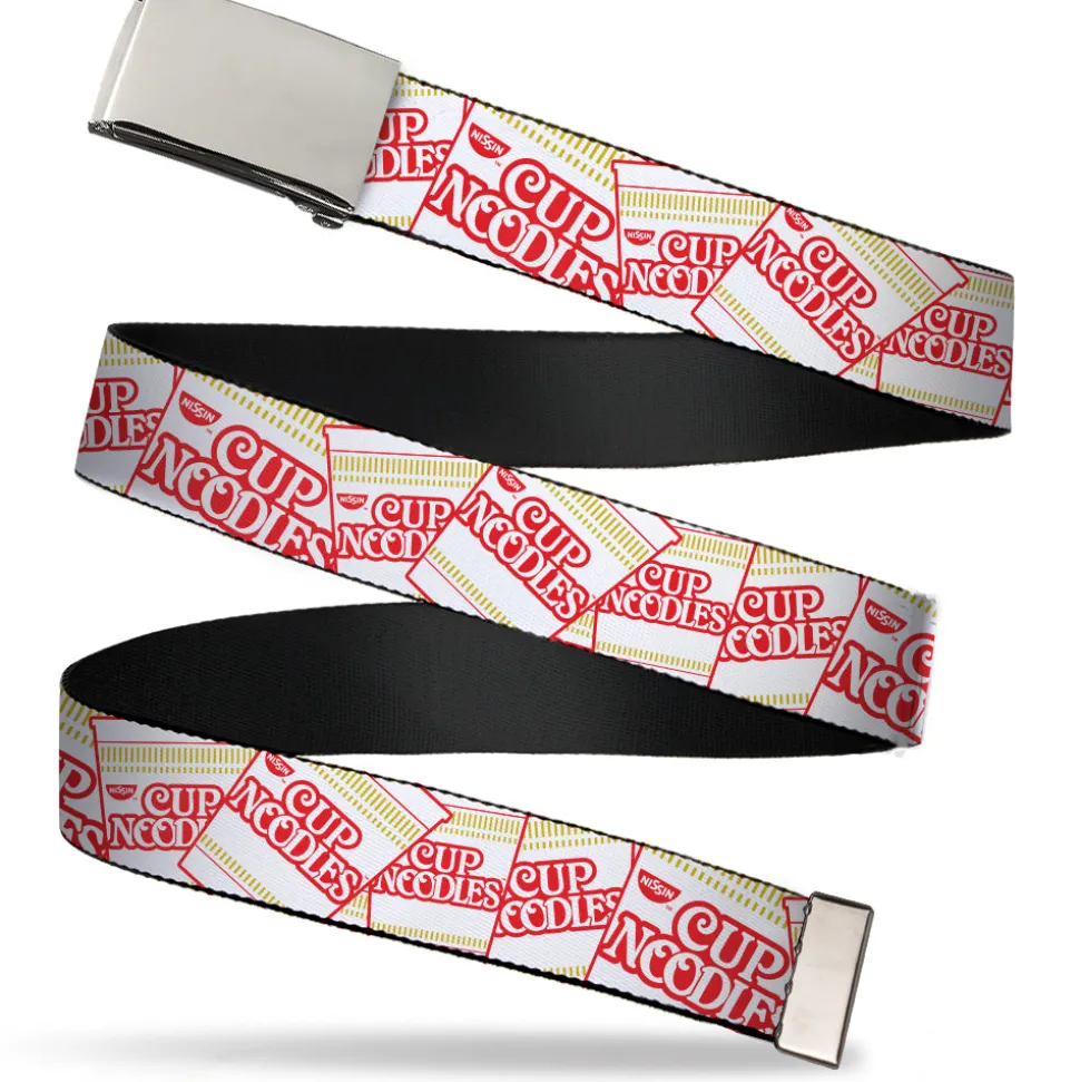 Web Belt Blank Matte Buckle – Cup Noodles Cups Stacked Collage White/Gold/Red Webbing