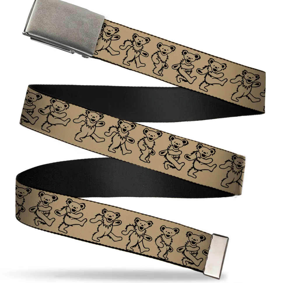 This unique web belt features a solid plain military-style clasp Buckle. It features beautiful artwork which is dyed into the fabric to ensure it looks great for years. This belt is available in 1.0″, 1.25″, and 1.5″ widths. 1.0″ wide belt is sized for children and adults with pants size 30 or lower. 1.25″ and 1.5″ wide belts are sized for adults, fitting up to pant size 42. This web belt is made from high-density nylon and steel. 1.5″ wide belt also has a bottle opener built into the back of the buckle! This product is Made in the USA by Buckle-Down Inc. and is officially licensed by Grateful Dead.