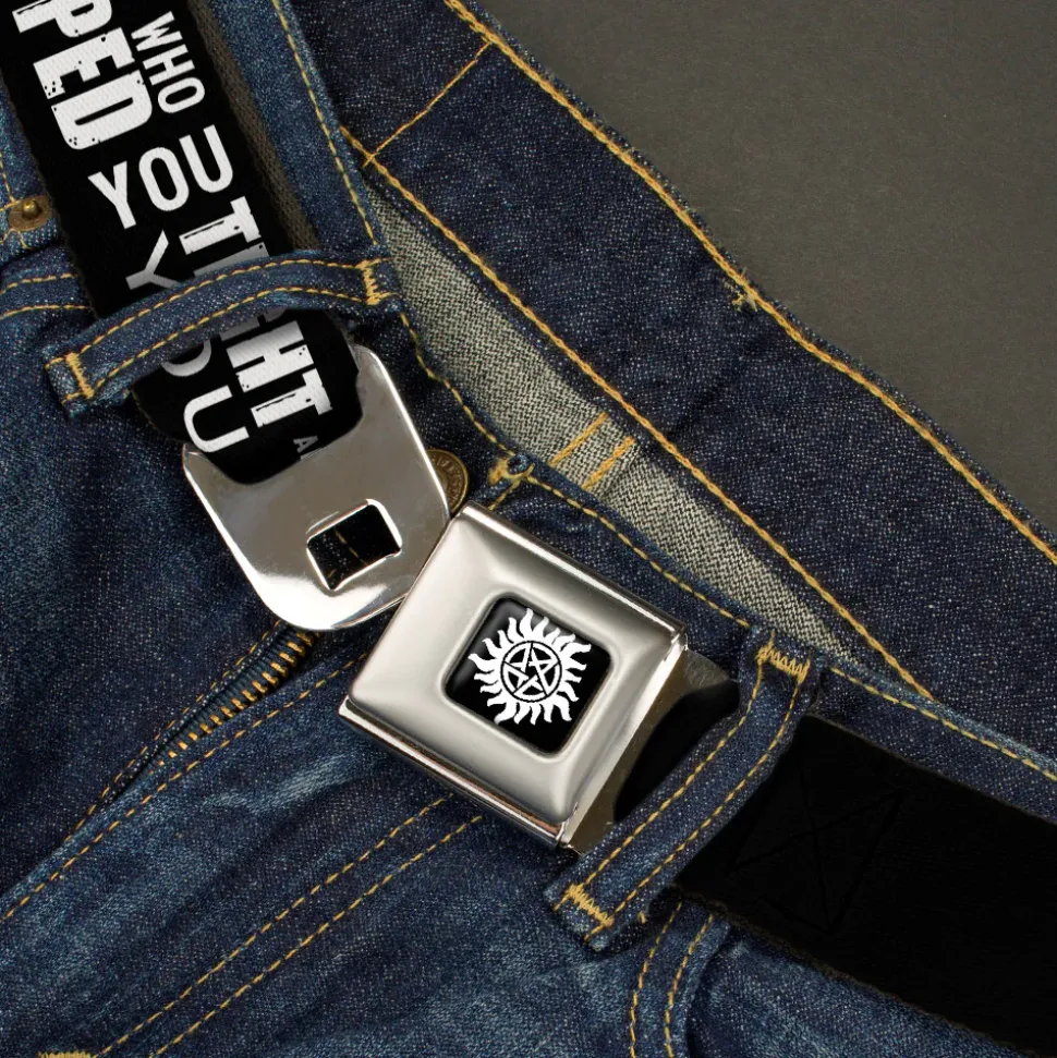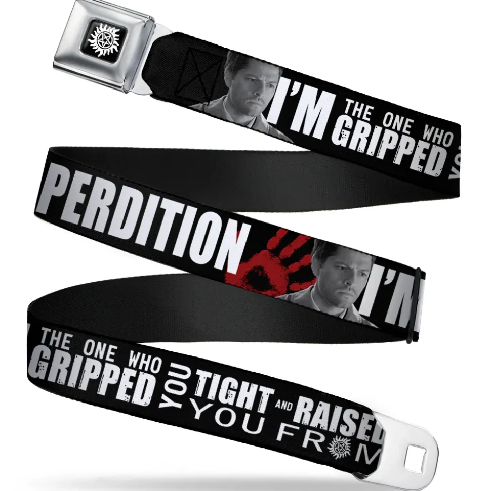Winchester Logo Full Color Black White Seatbelt Belt – Castiel/Hand Print RAISED FROM PERDITION Black/Red/Grays/White Webbing