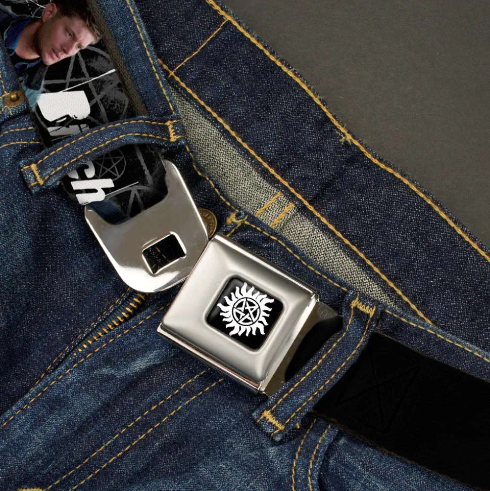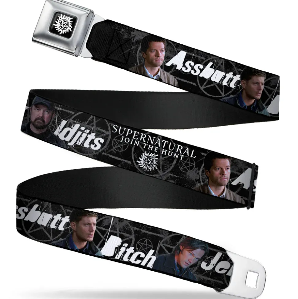 Winchester Logo Full Color Black White Seatbelt Belt – SUPERNATURAL 4-Character Poses/ASSBUTT-BITCH-JERK-IDJITS Black/Gray/White Webbing