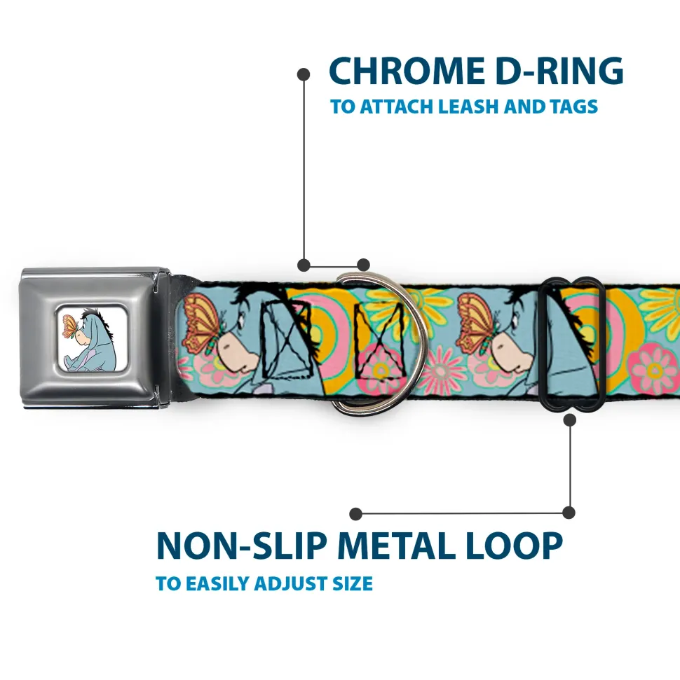 Winnie the Pooh Eeyore Butterfly Pose Full Color White Seatbelt Buckle Collar – Winnie the Pooh Eeyore Butterfly Pose Floral Collage Blue/Pinks/Yellows