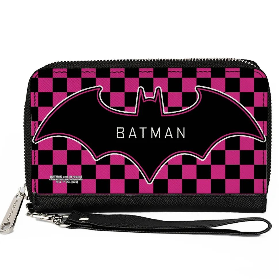 Women's PU Zip Around Wallet Rectangle - BATMAN Bat Logo Close-Up Checker Fuchsia Black