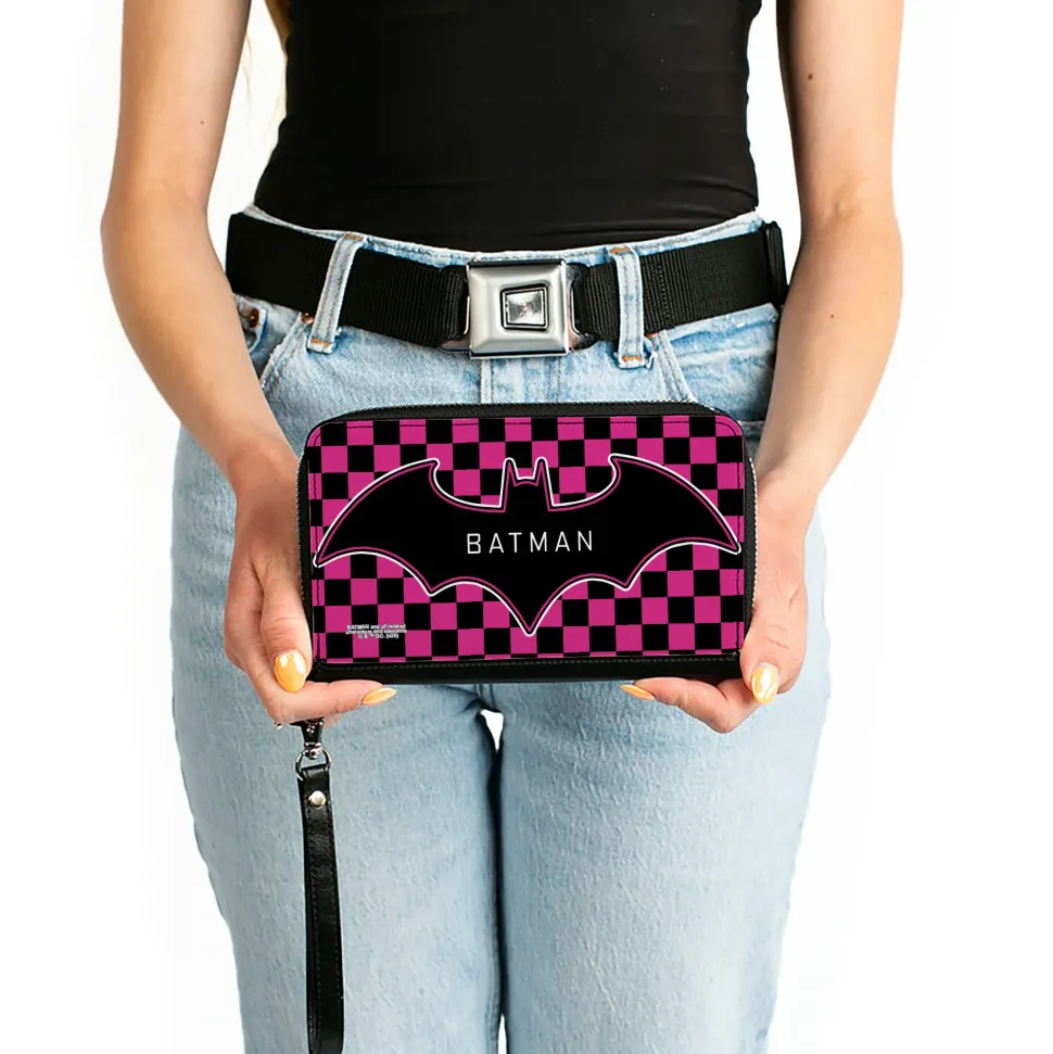 Women's PU Zip Around Wallet Rectangle – BATMAN Bat Logo Close-Up Checker Fuchsia Black