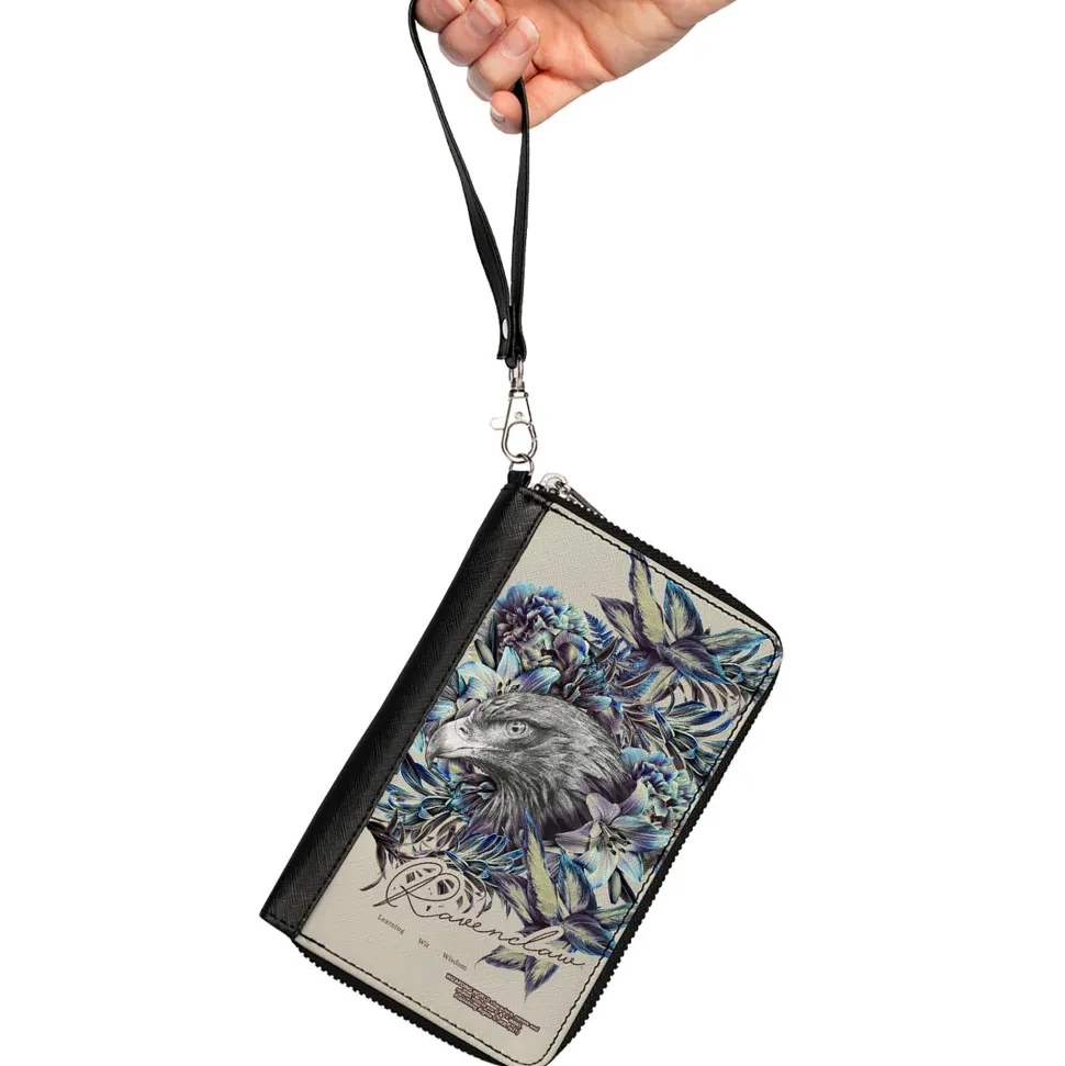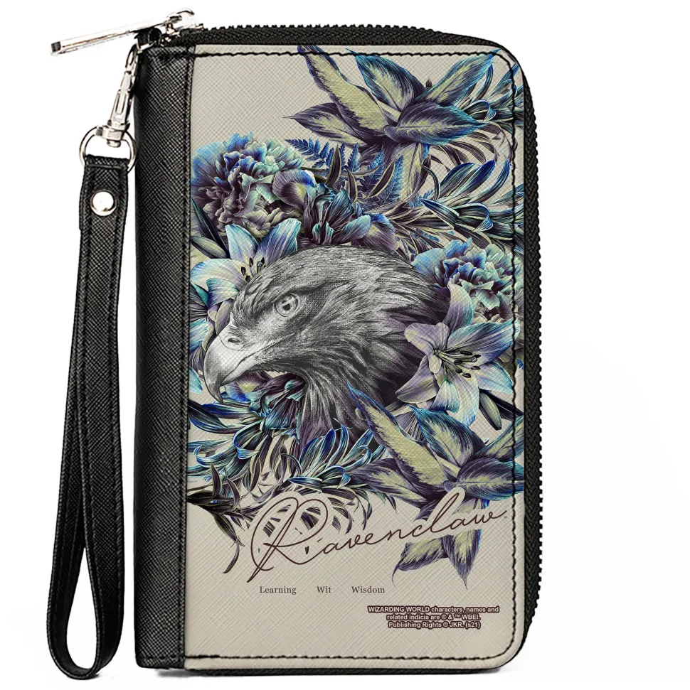 Women's PU Zip Around Wallet Rectangle - Harry Potter RAVENCLAW Floral Eagle Sketch Grays Blues