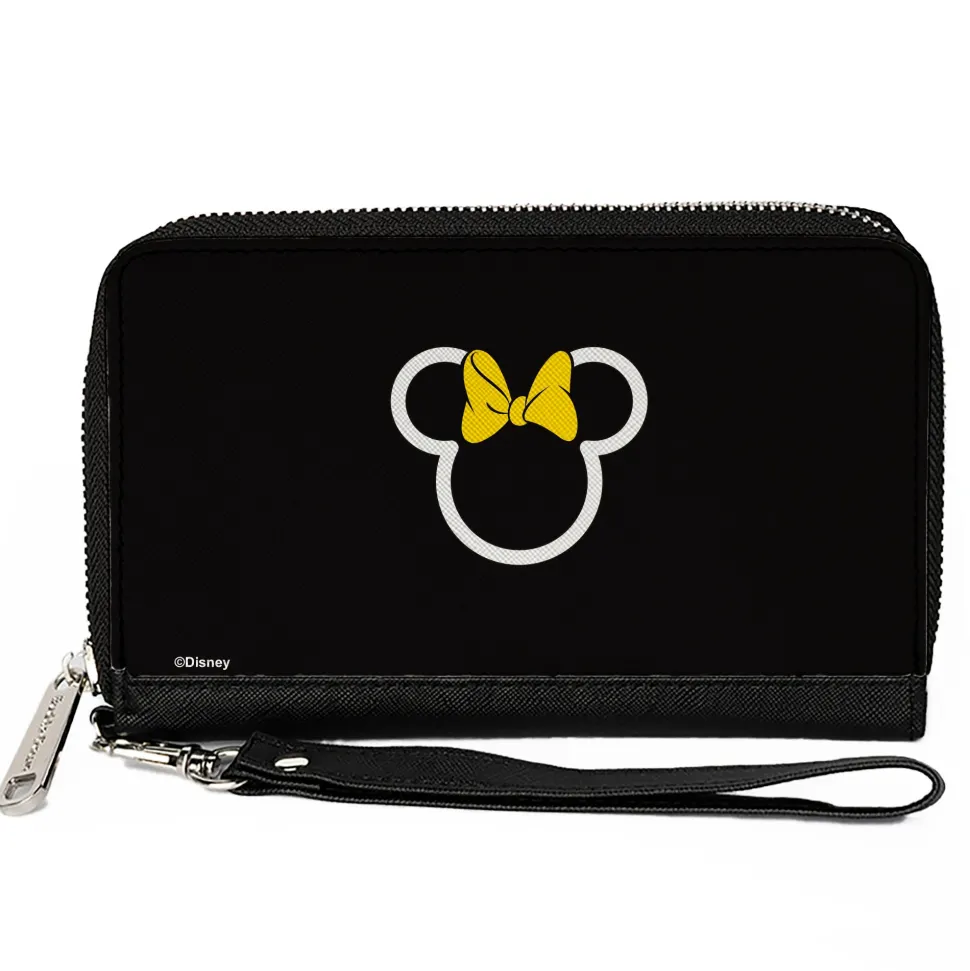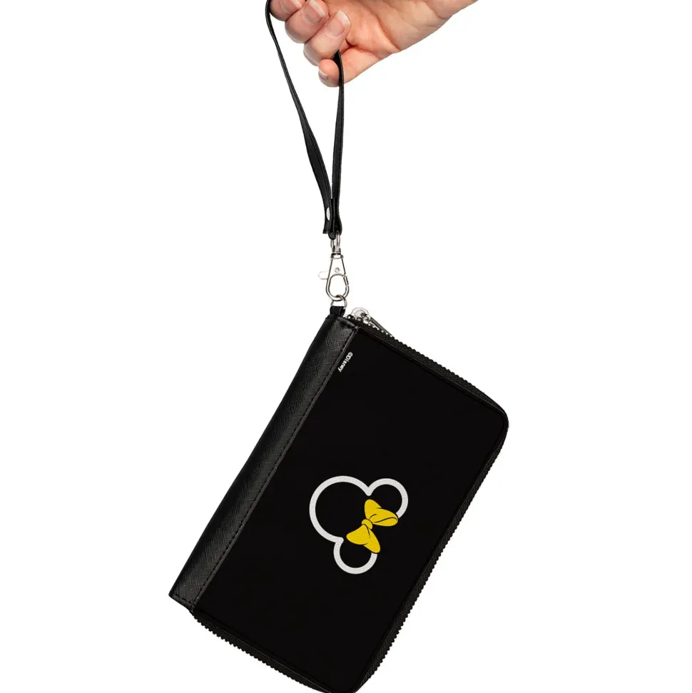 Women's PU Zip Around Wallet Rectangle - Minnie Mouse Ears and Bow Icon Outline Black White Yellow
