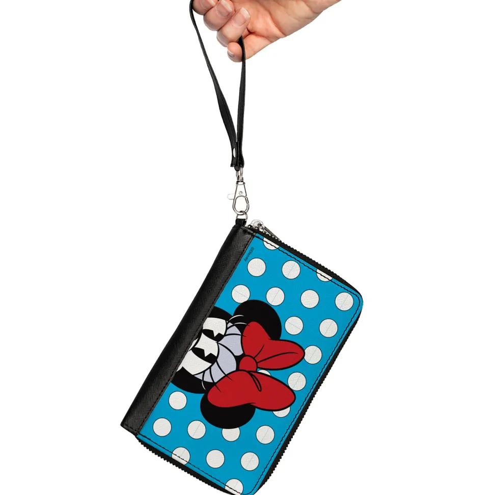 Women's PU Zip Around Wallet Rectangle - Minnie Style Face CLOSE-UP Dots Blue White