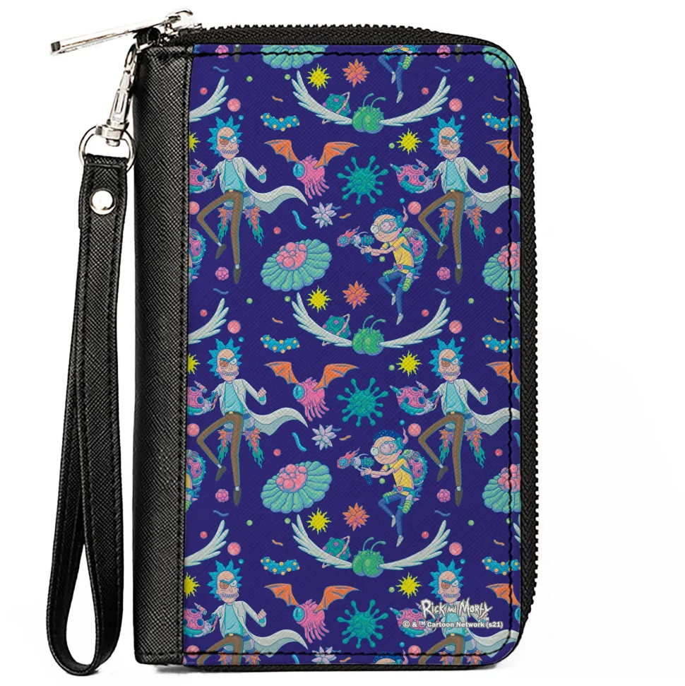Women's PU Zip Around Wallet Rectangle - Rick and Morty Aliens and Cells Portal Gun Collage Purple