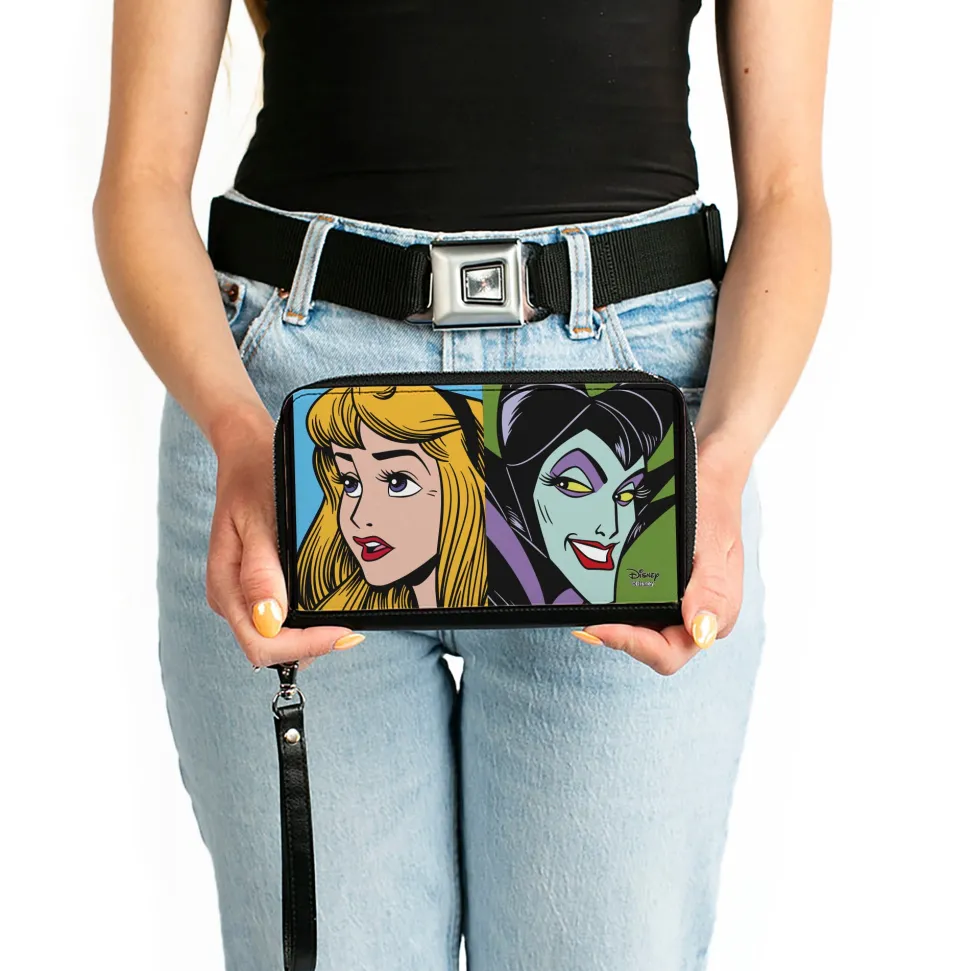 Women's PU Zip Around Wallet Rectangle - Sleeping Beauty Princess Aurora and Maleficent Face Blocks