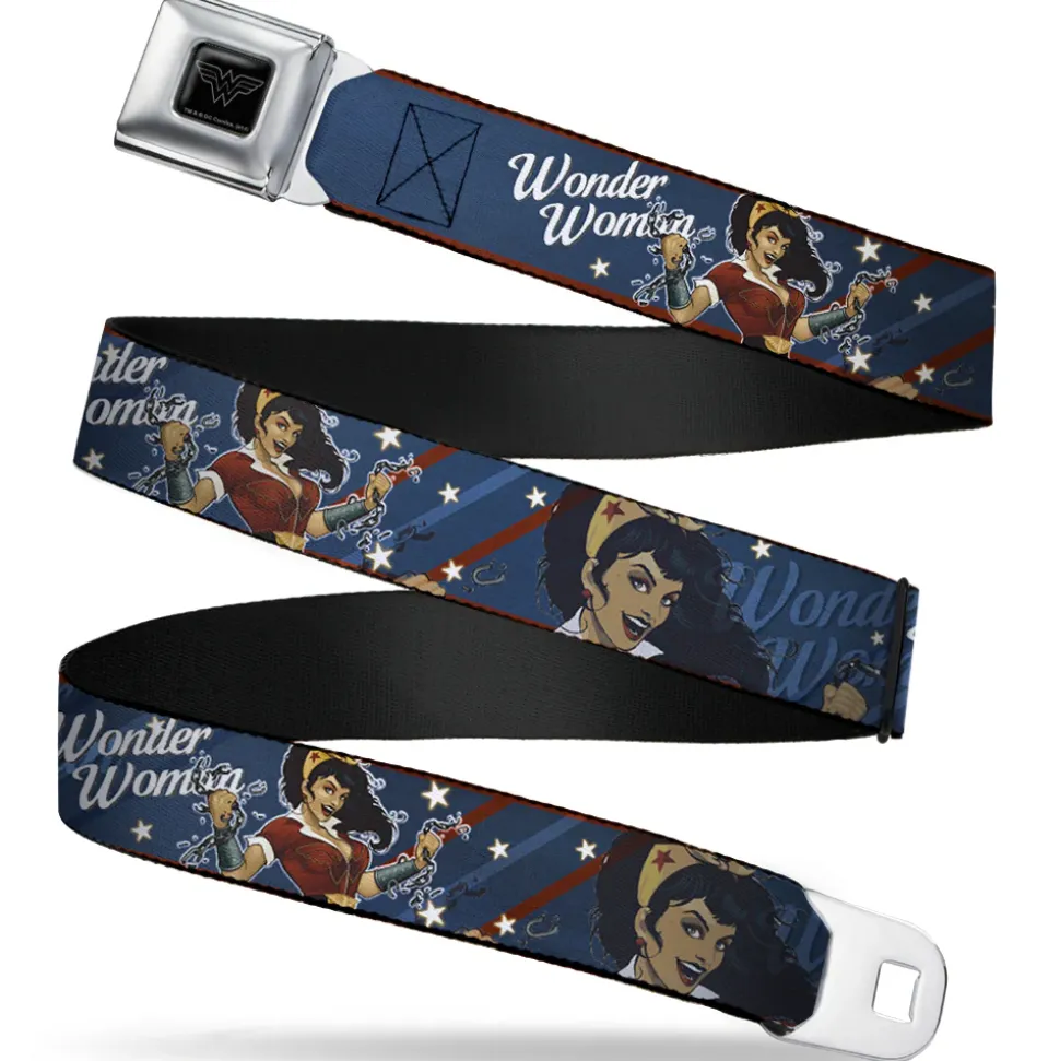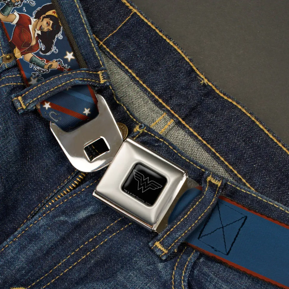 Wonder Woman Black Silver Seatbelt Belt – WONDER WOMAN/Bombshell Pose Blue/Red/White Webbing