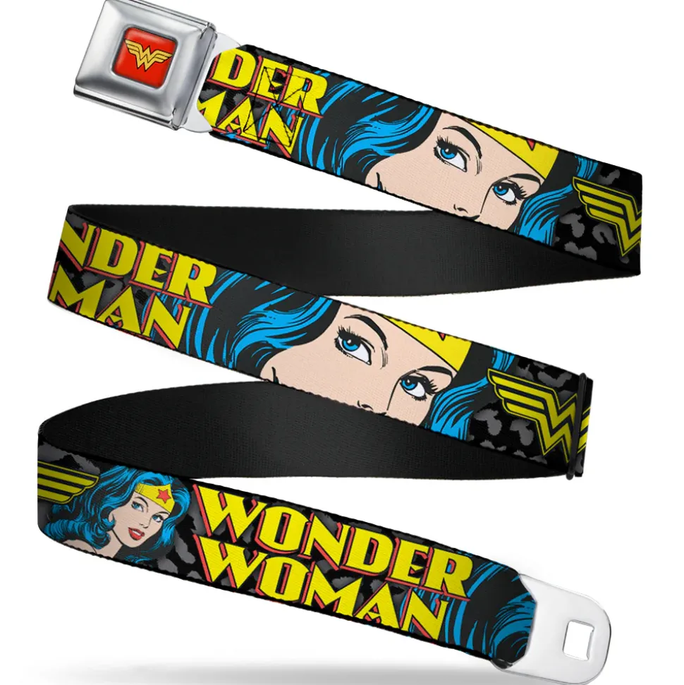 Wonder Woman Logo Full Color Red Seatbelt Belt – WONDER WOMAN w/Face CLOSE-UP Leopard Black/Gray Webbing